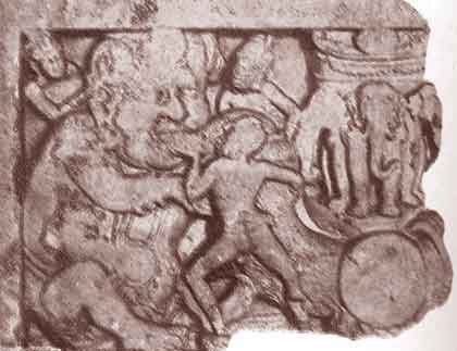 Mahilamukha overhearing the evil conversations of the burglars. Mahilamukha-Jataka, Amravati