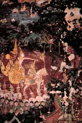 Siddhattha on chariot, the Thai version Upon his return to the city, he received the news of the birth of his son Rahula. When advanced further to the palace to see his newly born babe, he heard the royal lady Kisagotami singing out of joy at his graceful appearance. The song - Nibbutta nuna sa mata is very popular and is identified as Nibbuta Pada in the tradition. The word Nibbuta , which referred to the delivery of the mother in the above statement was interpreted by Siddhattha as Deliverence from the webs of worldly life. Rejoicing at the song Gotama took off his pearl necklace and sent it to the lady as a token of gratitude for having sung such a song.